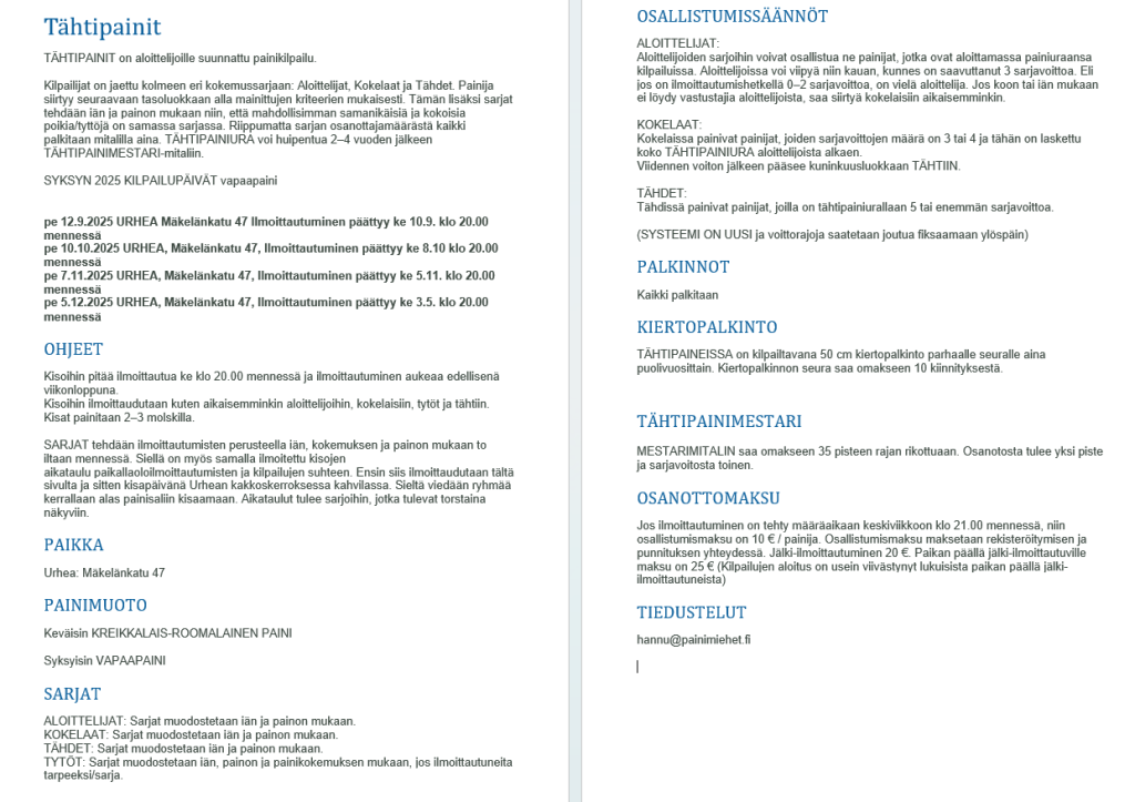 Helsingin Painimiehet järjestävät 8 kertaa vuodessa aloittelijoille suunnattuja kilpailuja, joihin on helppo mennä matalalla kynnyksellä ja pienillä kustannuksilla. Tähtipaineissa palkitaan kauden päätteksi eniten pisteitä saavuttanut seura. Espoon Urheilijat ovat voittaneet palkinnon kolmesti, viimeksi syksyllä 2019.